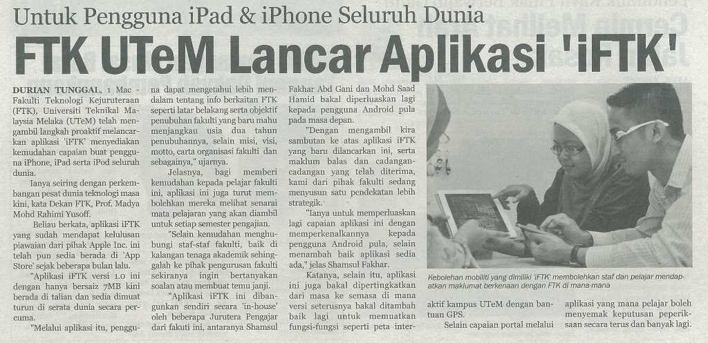 UNTUK PENGGUNA IPAD & IPHONE SELURUH DUNIA FTK UTEM LANCAR APLIKASI 'IFTK'