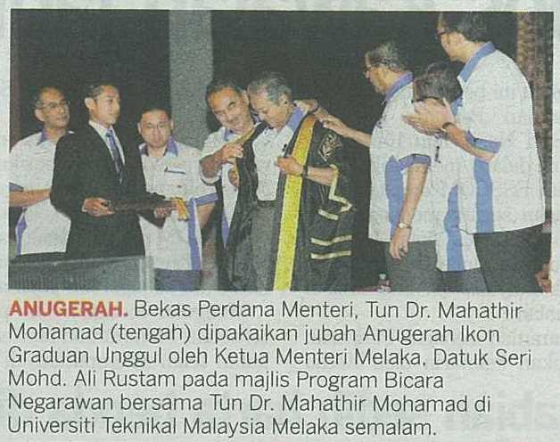 : | Berita Bergambar- ANUGERAH. Bekas Perdana Menteri, Tun Dr. Mahathir Mohamad (tengah) dipakaikan jubah Anugerah Ikon Graduan Unggul oleh Ketua Menteri Melaka, Datuk Seri Mohd. Ali Rustam pada Majlis Program Bicara Negarawan bersama Tun Dr. Mahathir Mohamad di Universiti Teknikal Malaysia Melaka semalam. |