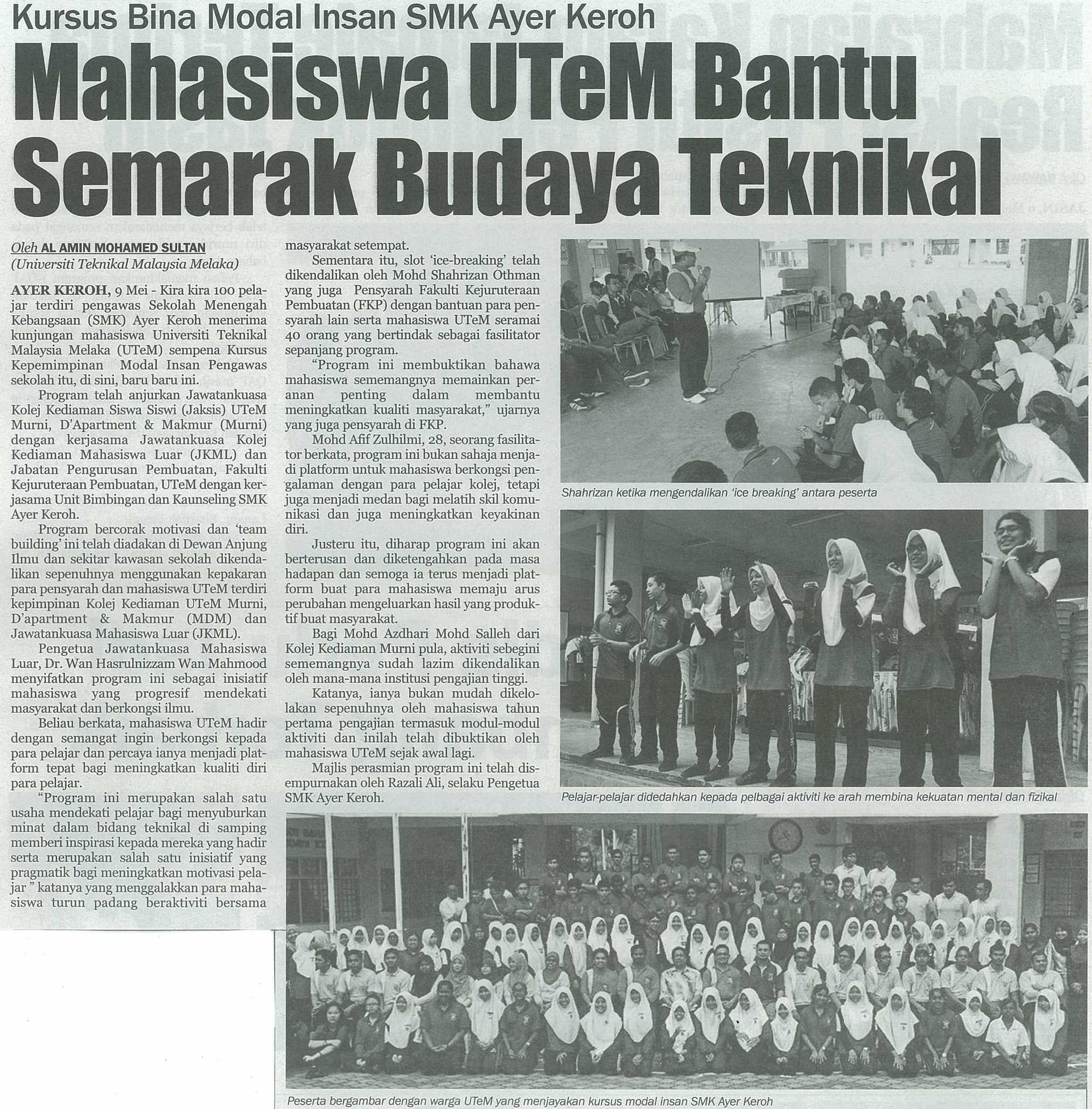 Kursus Bina Modal Insan SMK Ayer Keroh Mahasiswa UTeM Bantu Semarak Budaya Teknikal