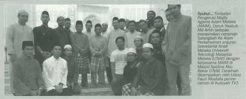 : | Berita Bergambar - Syukur... Timbalan Pengerusi Majlis Agama Islam Melaka (MAIM), Datuk Yaakub Md. Amin selepas merasmikan ceramah Selangkah Ke Alam Perkahwinan anjuran Sekretariat Anak Melaka Universiti Teknikal Malaysia Melaka (UTeM) dengan kerjasama MAIM di Masjid Saidina Abu Bakar UTeM. Ceramah disampaikan oleh Ustaz Fauzi Mustaffa penceramah Al Kuliyyah TV3 |