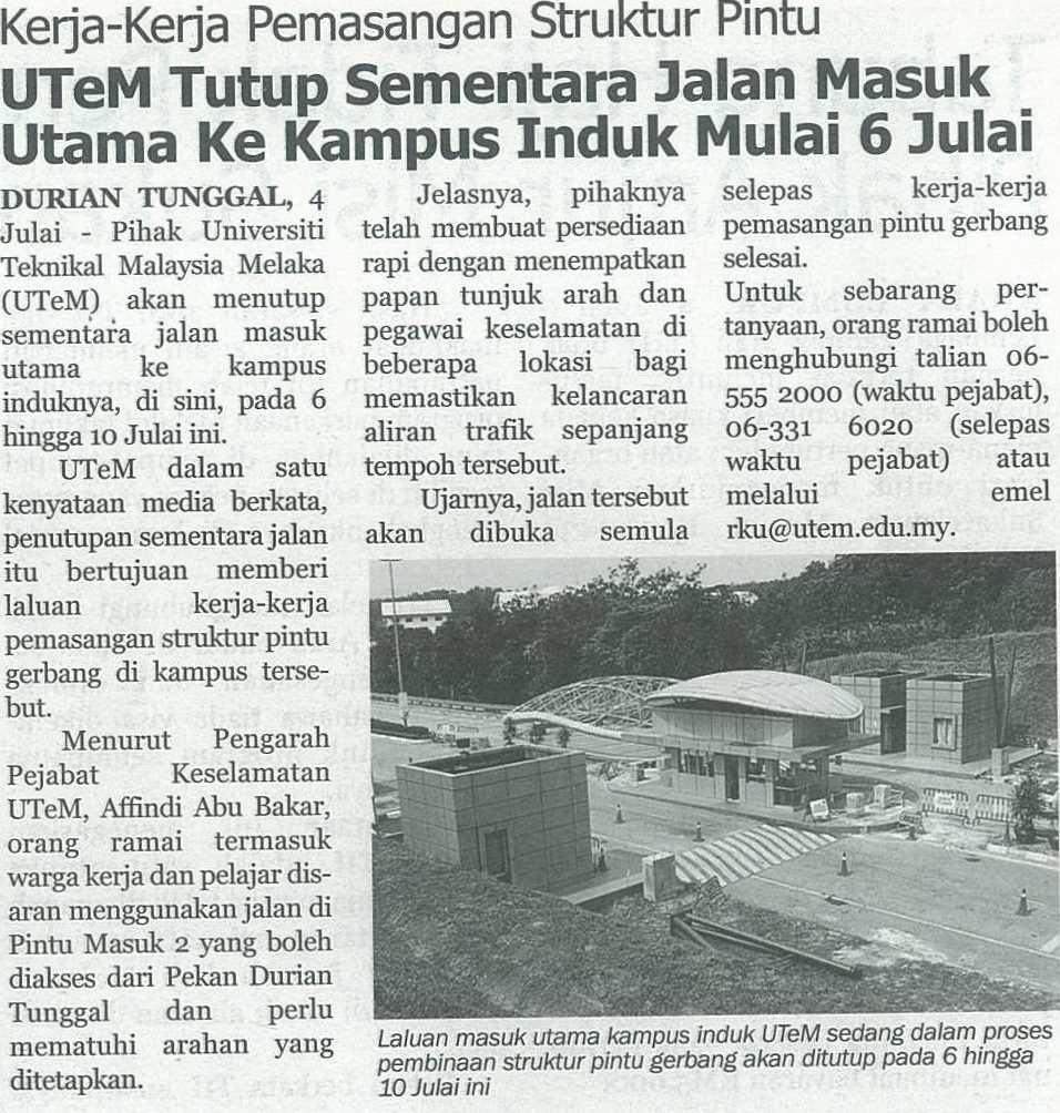 Kerja-Kerja Pemasangan Struktur Pintu UTeM Tutup Sementara Jalan Masuk Utama Ke Kampus Induk Mulai 6 Julai