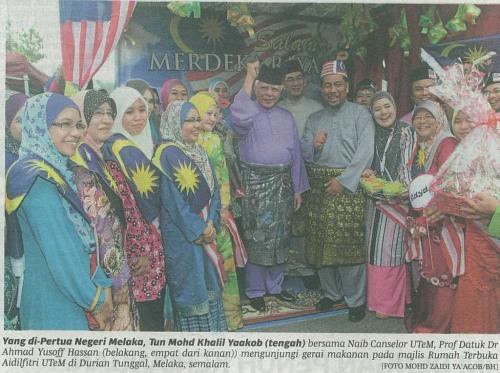 : | Berita Bergambar - Yang di-Pertua Negeri Melaka, Tun Mohd Khalil Yaakob (tengah) bersama Naib Canselor UTeM, Prof Datuk Dr Ahmad Yusoff Hassan (belakang ,empat dari kanan) mengunjungi gerai makanan pada majlis Rumah Terbuka Aidilfitri UTeM di Durian Tunggal Melaka, semalam. |