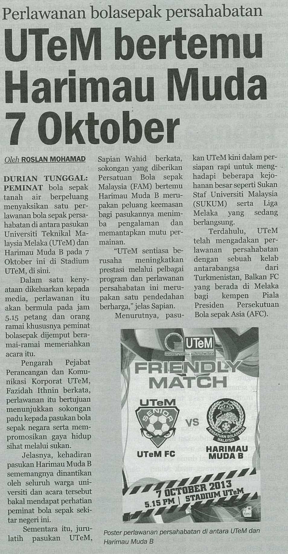 Perlawanan bolasepak persahabatan UTeM bertemu Harimau Muda 7 Oktober