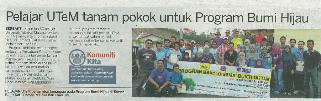 Pelajar UTeM tanam pokok untuk Program Bumi Hijau