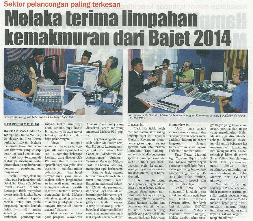 Sektor pelancongan paling berkesan Melaka terima limpahan kemakmuran dari Bajet 2014
