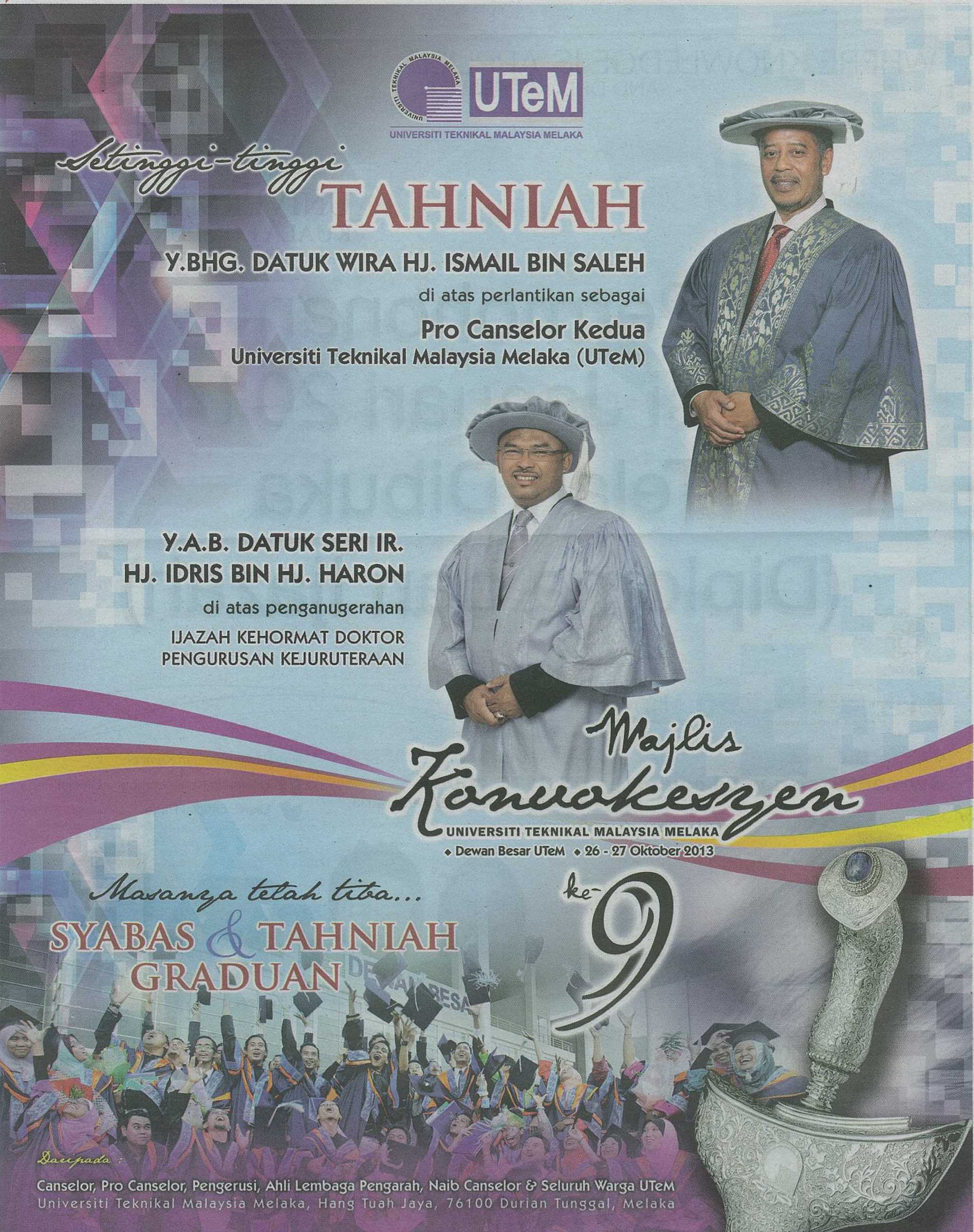 : | Iklan Ucapan Setinggi-tinggi Tahniah kepada Y.Bhg. Datuk Wira Hj. Ismail bin Saleh di atas perlantikan sebagai Pro Canselor Kedua Universiti Teknikal Malaysia Melaka (UTeM) & kepada Y.A.B. Datuk Seri Ir. Hj. Idris bin Hj. Haron di atas penganugerahan Ijazah Kehormat Doktor Pengurusan Kejuruteraan sempena Majlis Konvokesyen ke-9 daripada Canselor, Pro Canselor, Pengerusi, Ahli Lembaga Pengarah, Naib Canselor & Seluruh Warga UTeM |