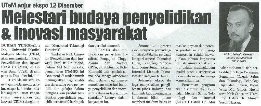 UTeM anjur ekspo 12 Disember Melestari budaya penyelidikan & inovasi masyarakat