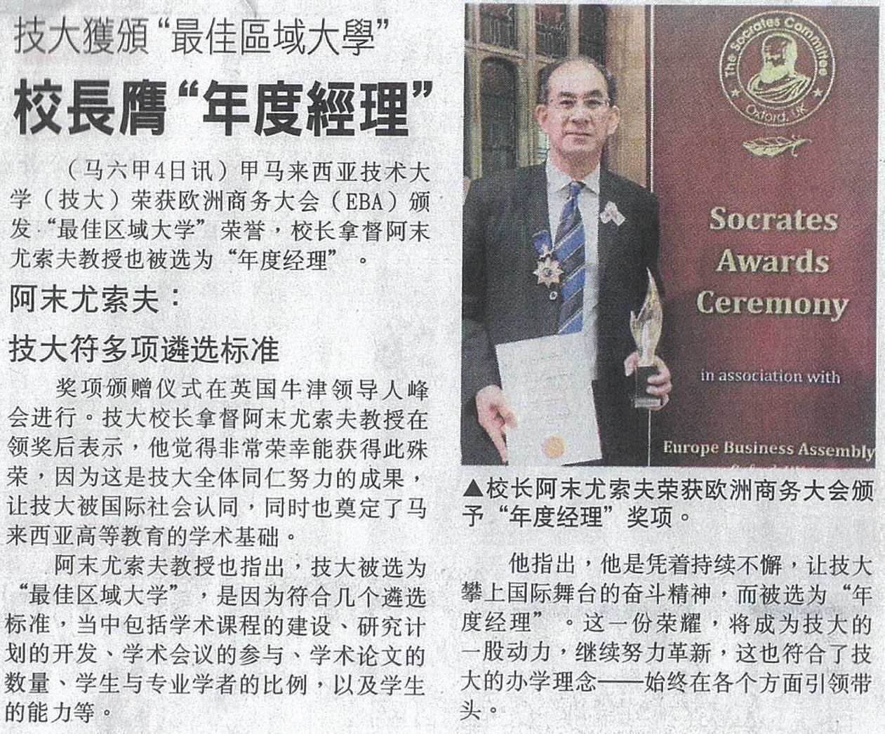 UTeM received the honor of being named the "Best Regional University" while the Vice-Chancellor, Prof. Datuk Dr. Ahmad Yusoff Hassan was named "Manager of the Year" by the Europe Business Assembly (EBA)