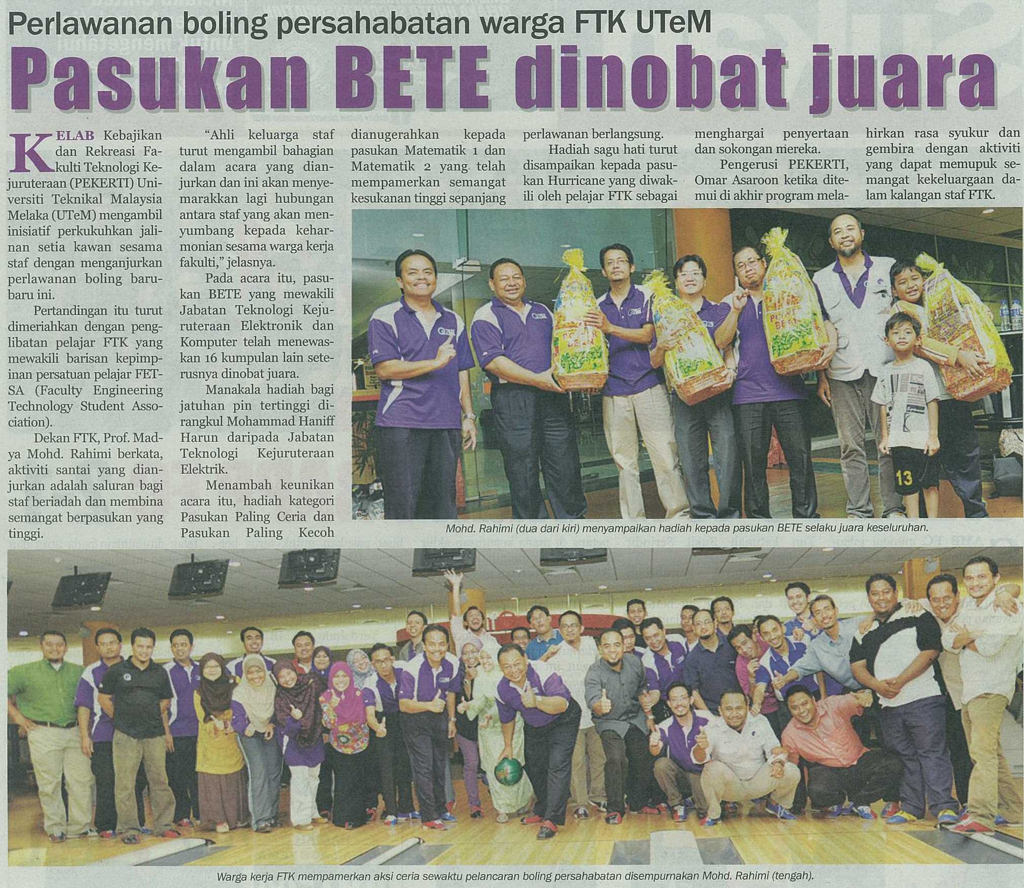 Perlawanan boling persahabatan warga FTK UTeM Pasukan BETE dinobat juara
