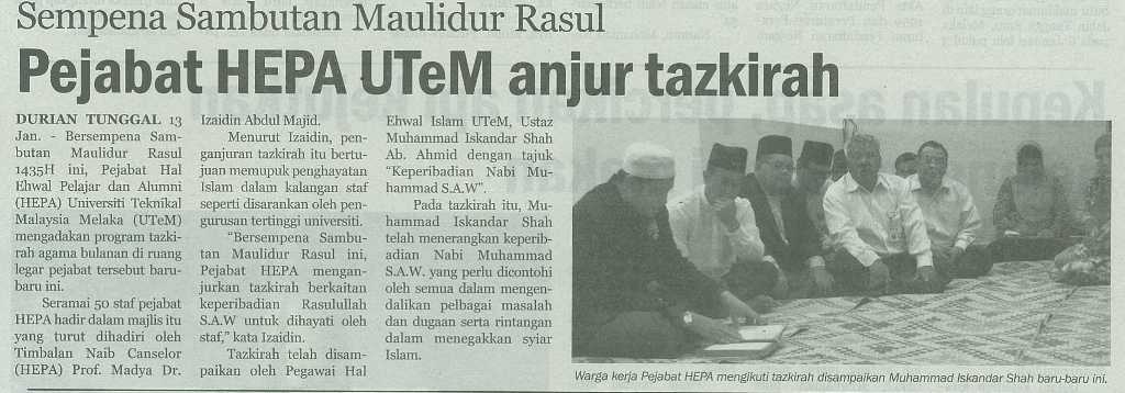 Sempena Sambutan Maulidur Rasul Pejabat HEPA UTeM anjur tazkirah
