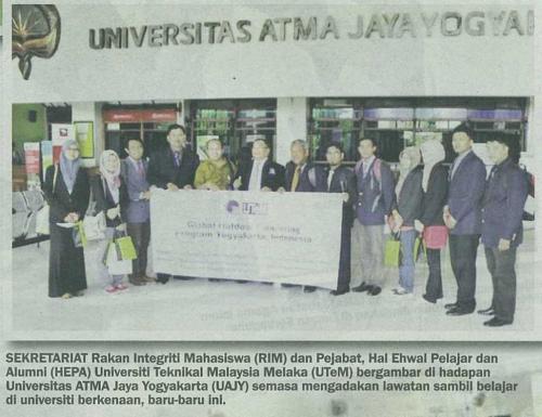 : | Sekretariat Rakan Integriti Mahasiswa (RIM) dan Pejabat Hal Ehwal Pelajar dan Alumni (HEPA) Universiti Teknikal Malaysia Melaka (UTeM) bergambar di hadapan Universitas ATMA Jaya Yogyakarta (UAJY)semasa mengadakan lawatan sambil belajar di universiti berkenaan, baru - baru ini. |