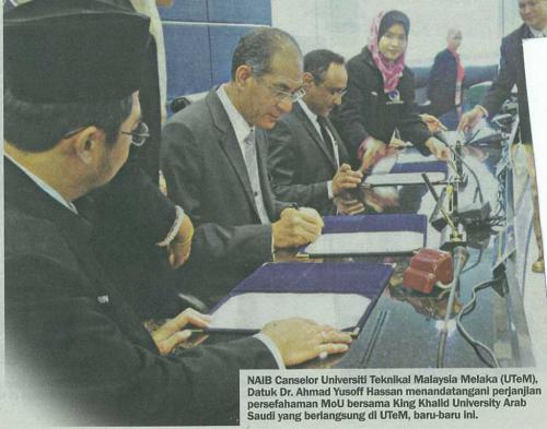 Berita bergambar Naib Canselor Universiti Teknikal Malaysia Melaka (UTeM), Datuk Dr. Ahmad Yusoff Hassan menandatangani perjanjian persefahaman Mou bersama King Khalid University Arab Saudi yang berlangsung di UTeM, baru-baru ini.