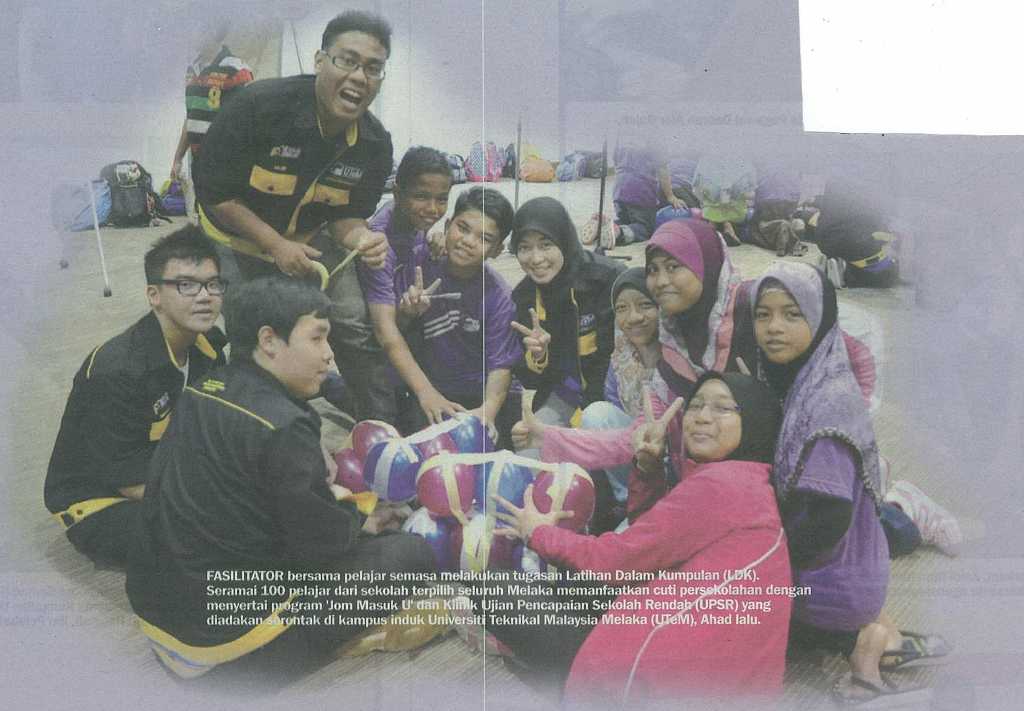 : | Berita bergambar.....FASILITATOR bersama pelajar semasa melakukan tugasan latihan dalam kumpulan (LDK).Seramai 100 pelajar dari sekolah terpilih seluruh Melaka memanfaatkan cuti persekolahan dengan menyertai program 'jom masuk u' dan klinik ujian pencapaian sekolah rendah (UPSR) yang diadakan serentak di kampus induk Universiti Teknikal Malaysia Melaka (UTeM), Ahad lalu. |