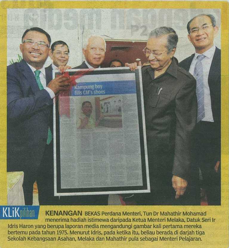 : | Kenangan Bekas Perdana Menteri, Tun Dr Mahathir Mohamad menerima hadiah istimewa daripada Ketua Menteri Melaka, Datuk Seri Ir Idris Haron yang berupa laporan media mengandungi gambar kali pertama mereka bertemu pada tahun 1975. Menurut Idris, pada ketika itu, beliau berada di darjag tiga Sekolah Kebangsaan Asahan, Melaka dan Mahathir sebagai Menteri Pelajaran. |