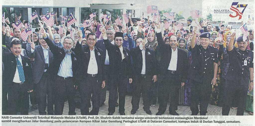 : | Berita bergambar....Naib Canselor Universiti Teknikal Malaysia Melaka (UTeM), Prof. Dr. Shahrin Sahib bersama warga universiti berkenaan melaungkan Merdeka! sambil mengibarkan Jalur Gemilang pada pelancaran Kempen Kibar Jalur Gemilang Peringkat UTeM di Dataran Canselori, Kampus induk di Durian Tunggal, semalam. |