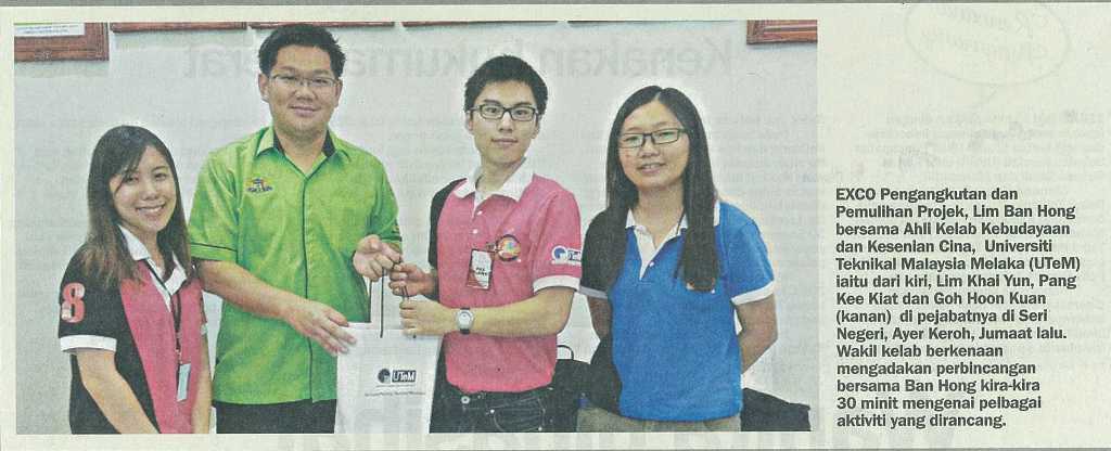 : | EXCO Pengangkutan dan Pemulihan Projek, Lim Ban Hong bersama Ahli Kelab Kebudayaan dan Kesenian Cina, Universiti Teknikal Malaysia Melaka (UTeM) iaitu dari kiri, Lim Khai Yun, Pang Kee Kiat dan Goh Hoon Kuan(kanan) di pejabatnya di Seri Negeri, Ayer Keroh, Jumaat lalu. Wakil kelab berkenaan mengadakan perbincangan bersama Ban Hong kira-kira 30 minit mengenai pelbagai aktiviti yang dirancang. |