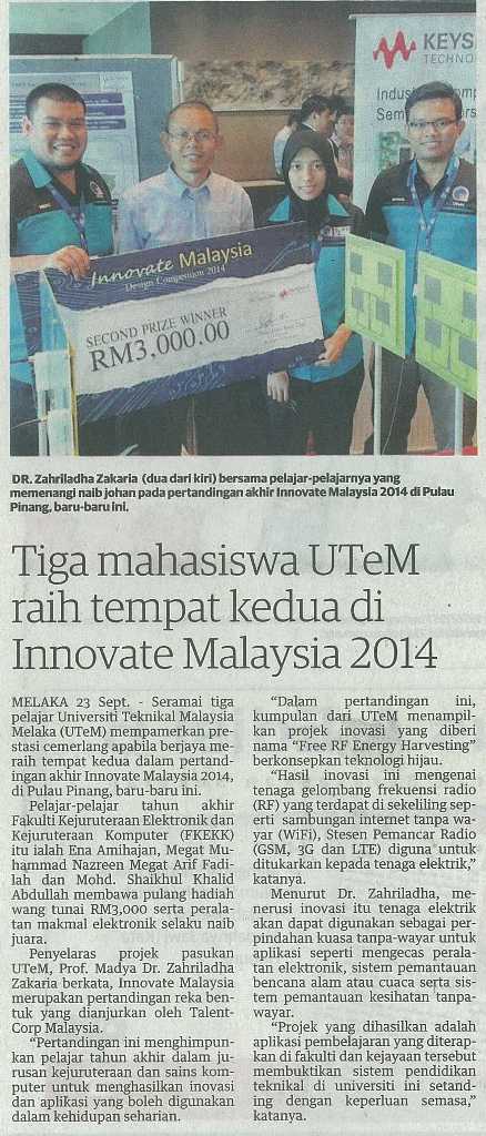 Tiga mahasiswa UTeM raih tempet kedua di Innovate Malaysia 2014