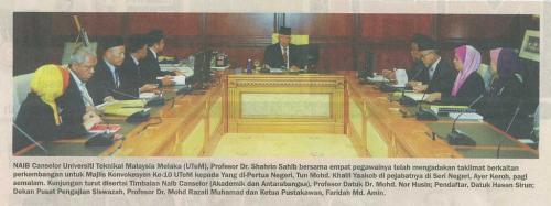 : | Naib Canselor Universiti Teknikal Malaysia Melaka (UTeM), Profesor Dr Shahrin Sahib bersama empat pegawainya telah mengadakan taklimat berkaitan perkembangan untuk Majlis Konvokesyen Ke-10 UTeM kepada Yang di-Pertua Negeri, Tun Mohd. Khalil Yaakob di pejabatnya di Seri Negeri, Ayer Keroh, pagi semalam. Kunjungan turut disertai Timbalan Naib Canselor (Akademik dan Antarabangsa), Profeser Datuk Dr. Mohd Nor Husin, Pendaftar Datuk Hasan Sirun, Dekan Pusat Pengajian Siswazah Profeser Dr. Mohd Razali Muhamad dan Ketua Pustakawan , Faridah Md Amin. |