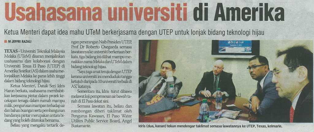 Usahasama universiti di Amerika Ketua Menteridapat idea mahu UTeM bekerjasama dengan UTEP untuk lonjak bidang teknologi hijau.