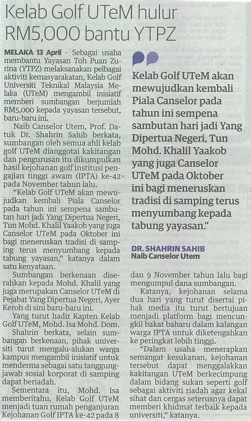 Kelab Golf UTeM hulur RM5000 bantu YTPZ