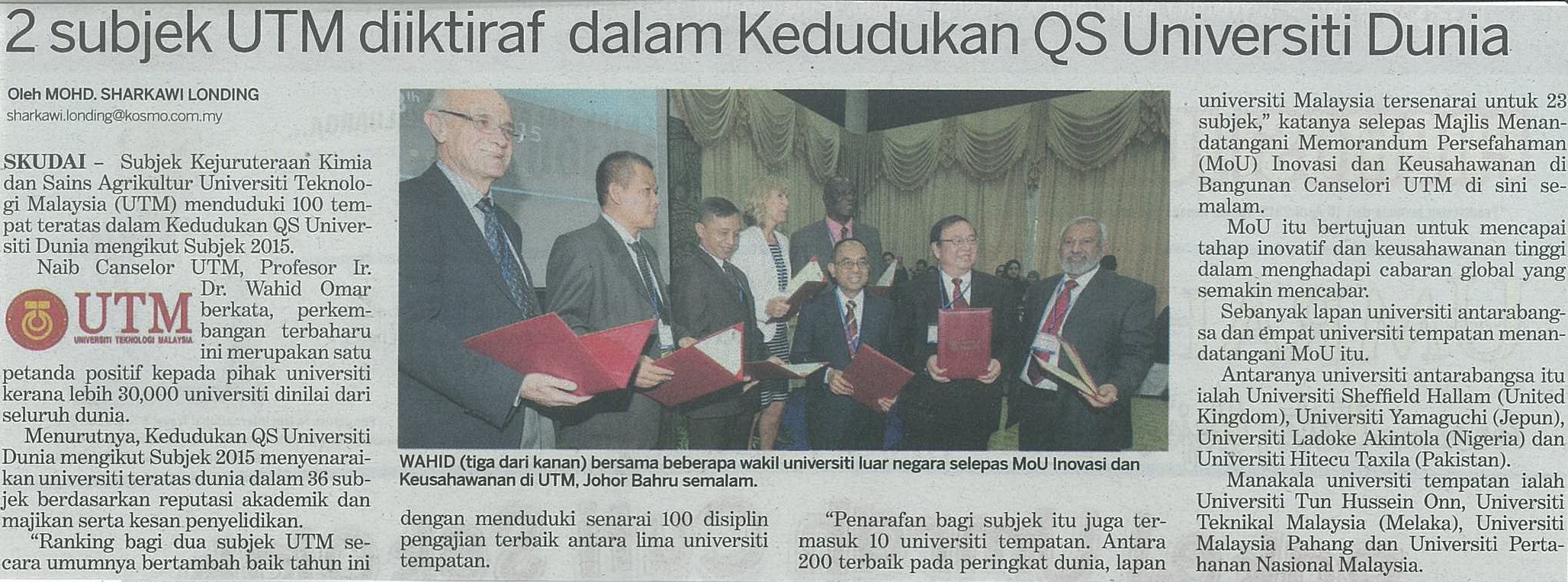 2 subjek UTM diiktiraf dalam keddukan QS Universiti Dunia