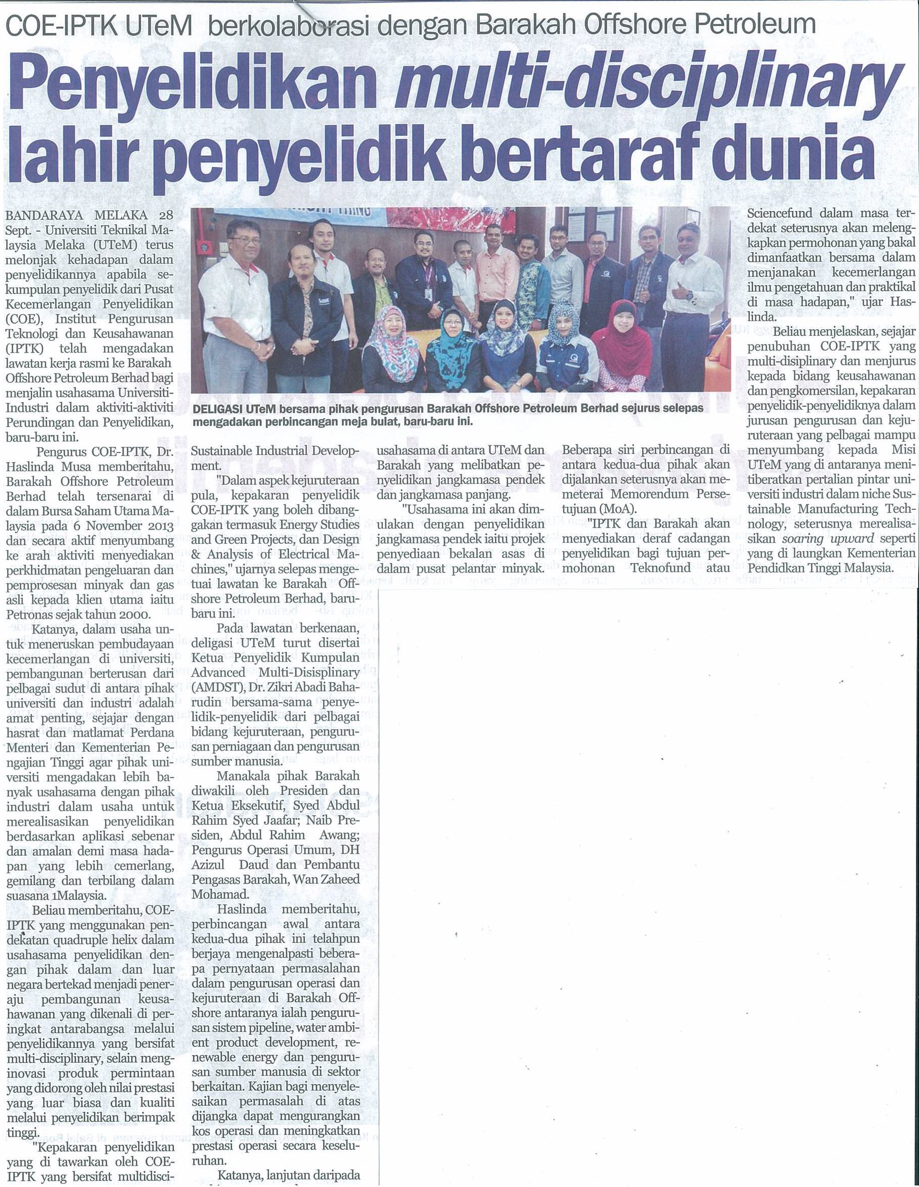 COE-IPTK UTeM berkolaborasi dengan Barakah Offshore Petroleum