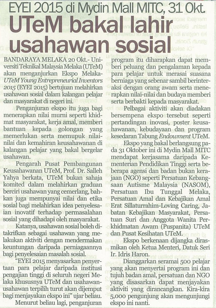 EYEI 2015 di Mydin Mall MITC, 31 OKT (UTeM bakal lahir usahawan sosial)
