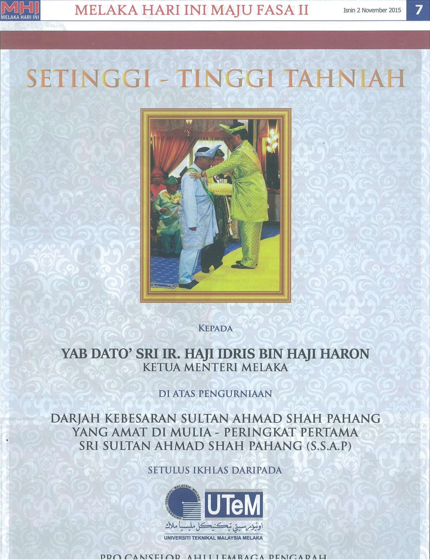 Ucapan Setinggi-tinggi tahniah kepada Ketua Menteri Melaka daripada UTeM