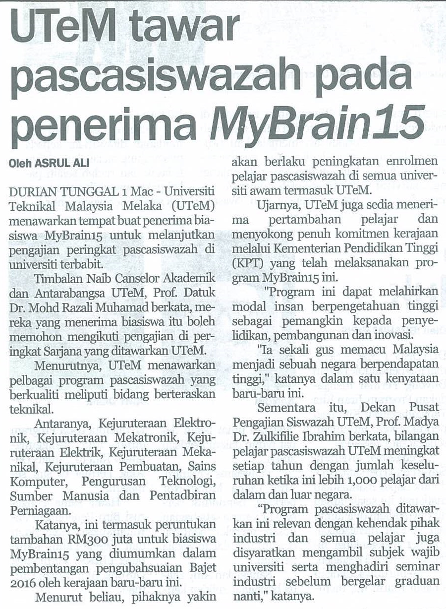 UTeM tawar pascasiswazah pada penerima MyBrain15