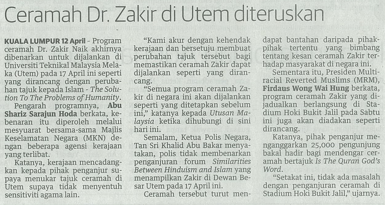 Ceramah Dr. Zakir Naik di UTeM diteruskan