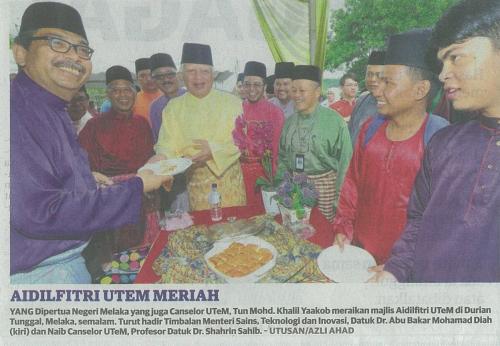: | Yang Dipertua Negeri Melaka yang juga Canselor UTeM, Tun Mohd. Khalil Yaakob meraikan majlis Aidilfitri UTeM di Durian Tunggal, Melaka, semalam. Turut hadir Timbalan Menteri Sains, Teknologi dan Inovasi, Datuk Dr. Abu Bakar Mohd Diah dan Naib Canseor UTeM, Profesor Datuk Dr. Shahrin Sahib. |