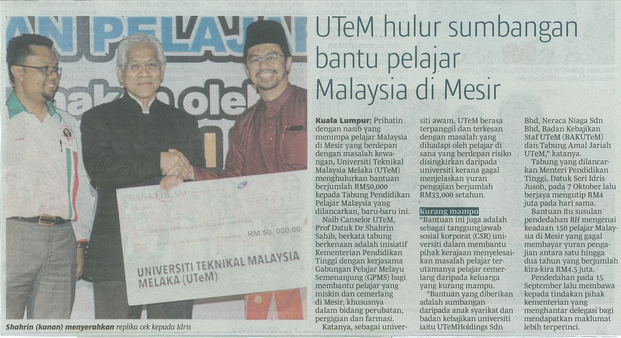 UTeM hulur sumbangan bantu pelajar Malaysia di Mesir