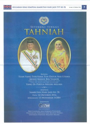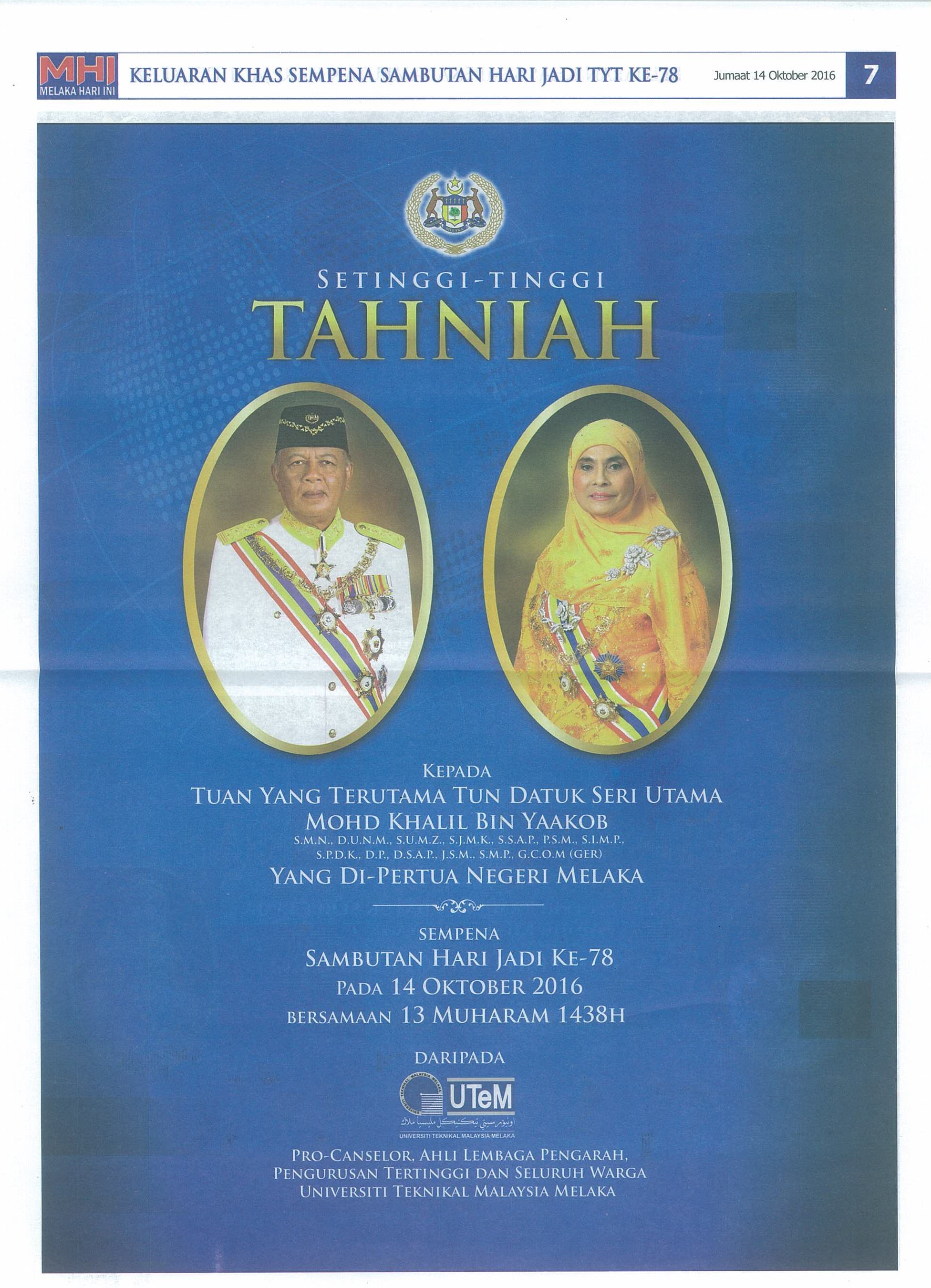 Ucapan Tahniah kepada Yang Di Pertua Negeri Melaka Sempena Hari Jadi ke-78