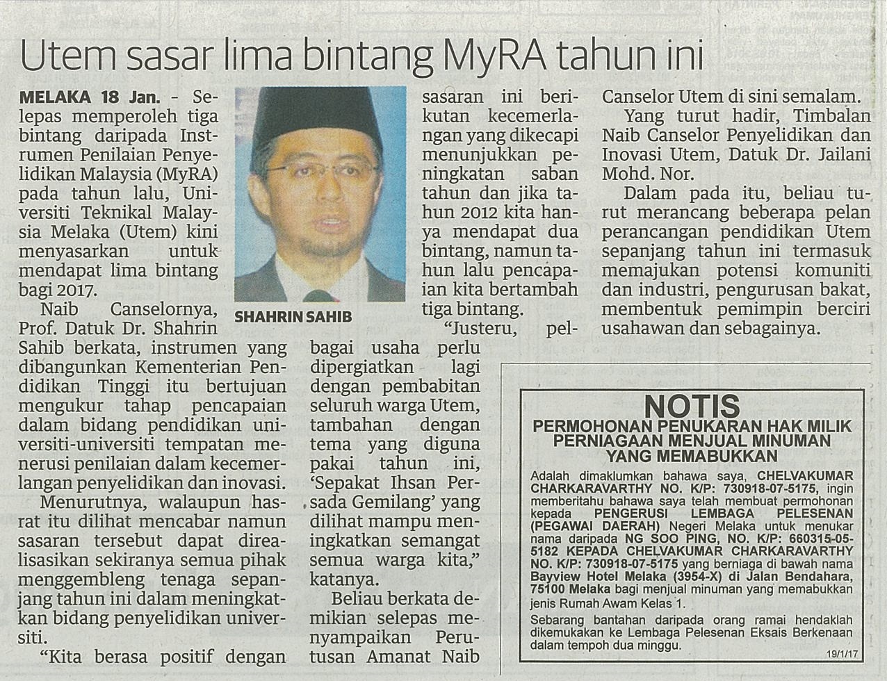 UTeM Sasar Lima Bintang Myra Tahun Ini
