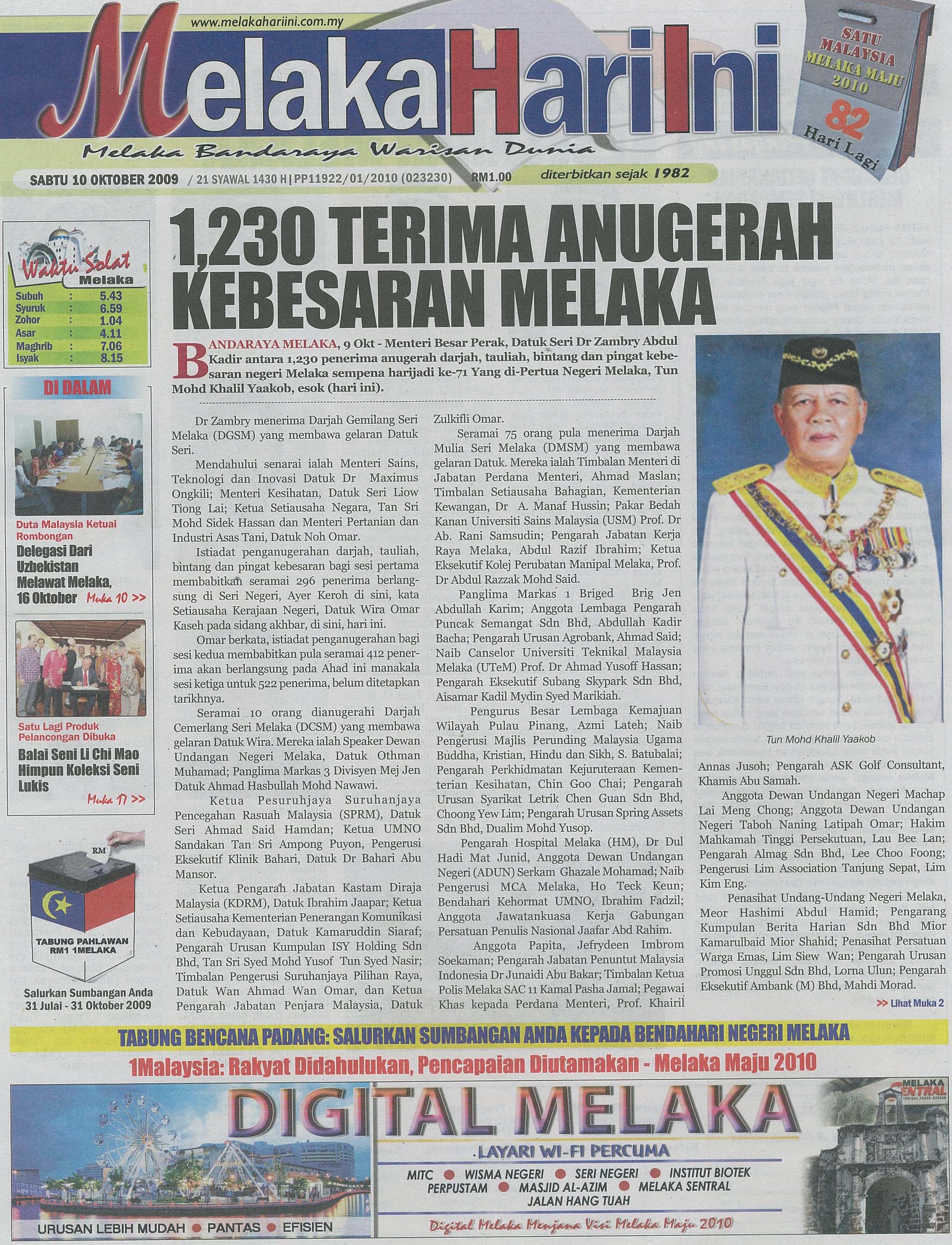 Muka depan MHI - 1230 terima Anugerah Kebesaran Melaka