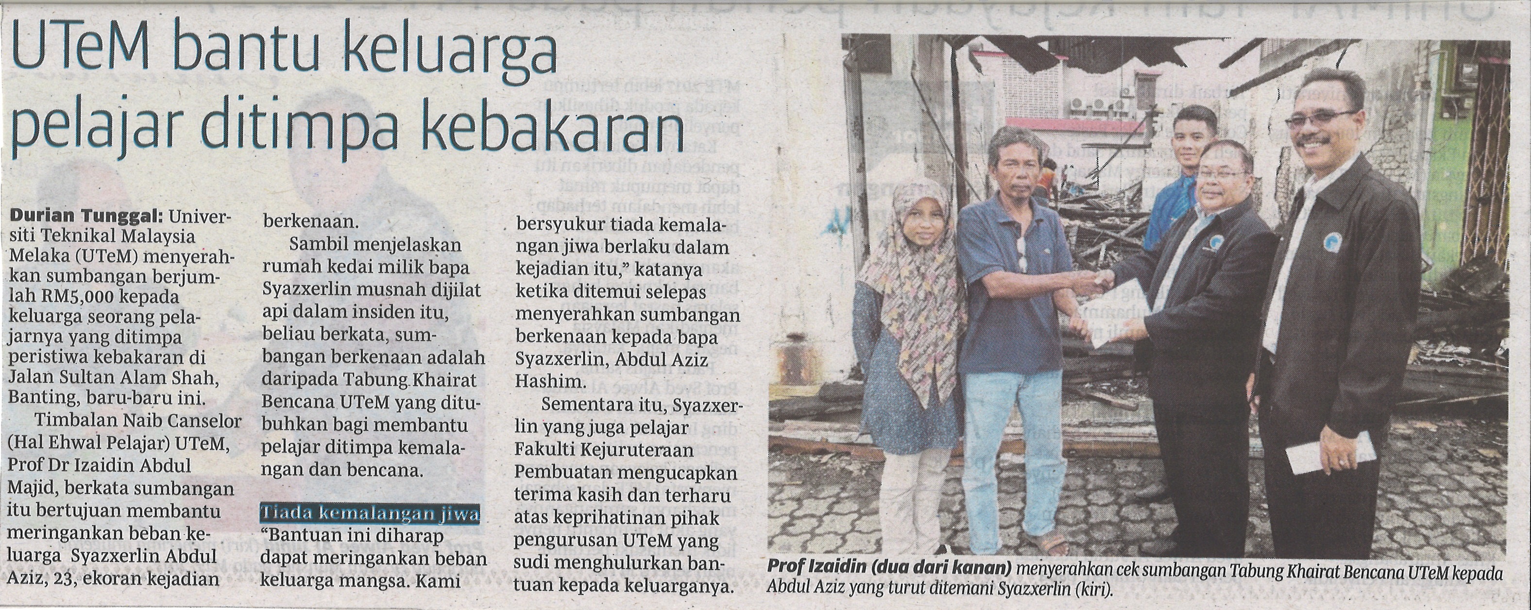 UTeM bantu keluarga pelajar ditimpa kebakaran