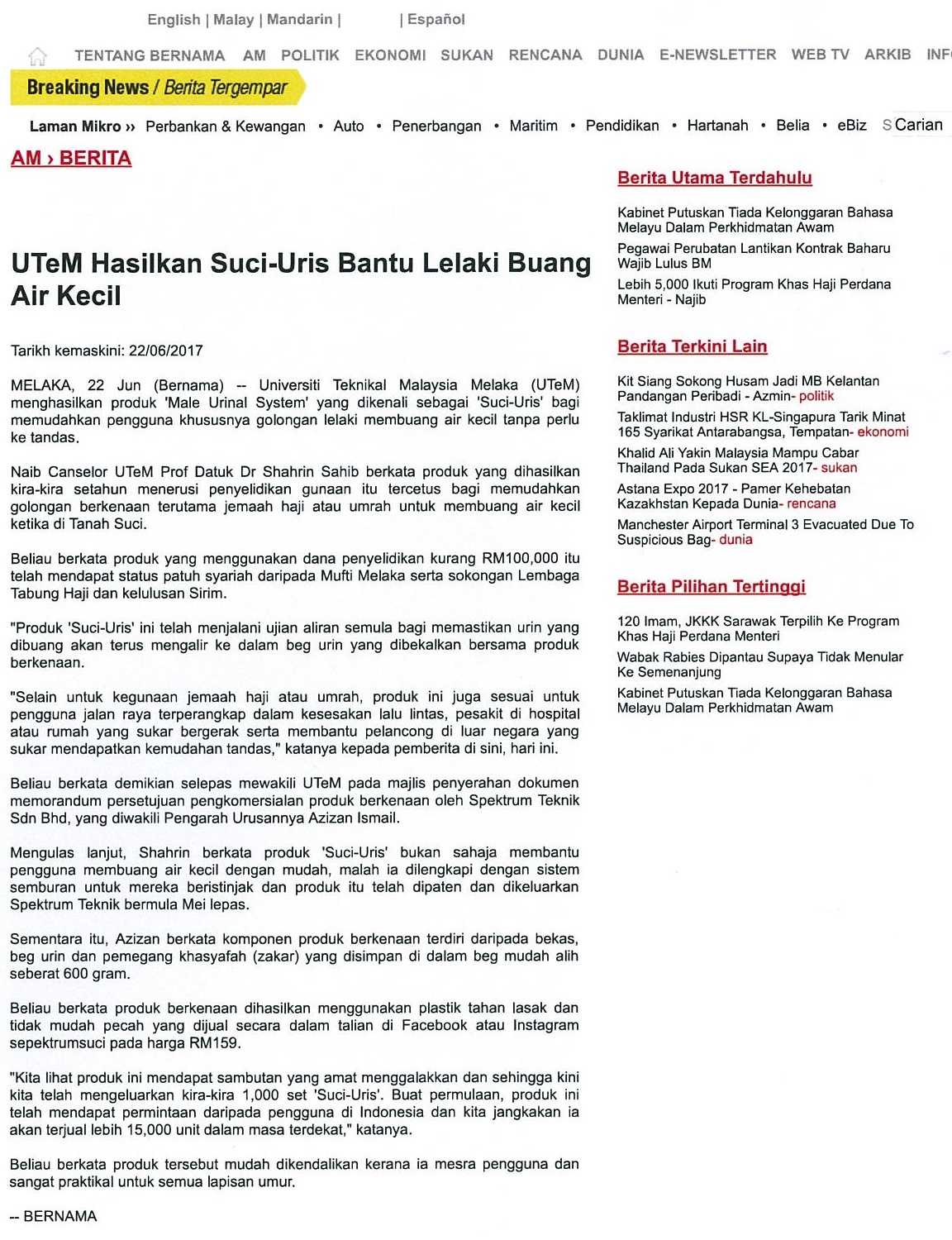 UTeM hasilkan suci-uris bantu lelaki buang air kecil