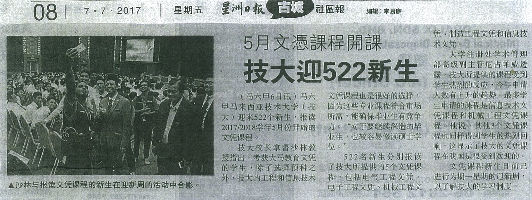 Pengambilan pelajar Diploma seramai 522 orang pada Mei 2017 di UTeM