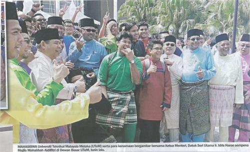 MAHASISWA Universiti Teknikal Malaysia Melaka (UTeM) serta para kenamaan bergambar bersama Ketua Menteri, Datu Seri Utama Ir. Idris Haron sempena Majlis Mahabbah Aidilfitri di Dewan Besar UTeM, Isnin lalu.