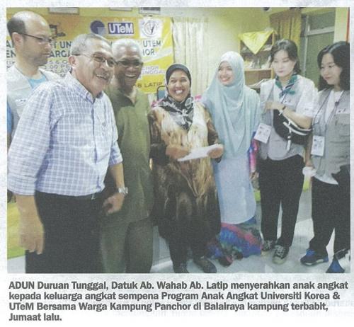 ADUN Durian Tunggal Datuk Ab. Wahab Ab.Latip menyerahkan anak angkat kepada keluarga angkat sempena Program Anak Angkat Universiti Korea dan UTeM bersama warga kampung Panchor di balairaya kampung terbabit jumaat lalu