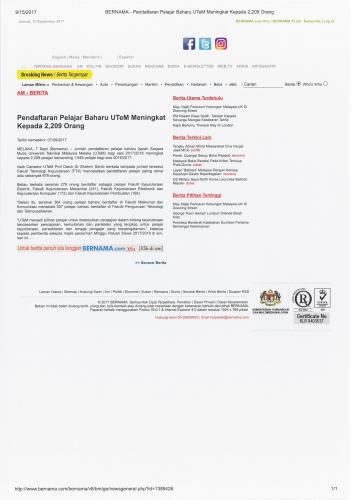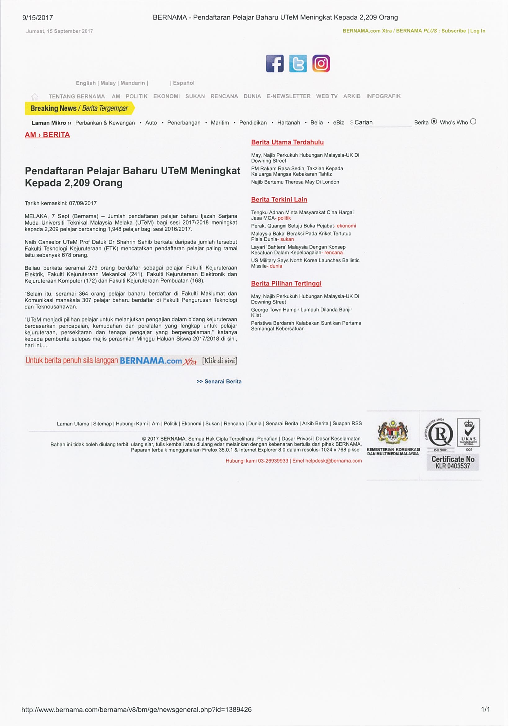 PENDAFTARAN PELAJAR BAHARU UTeM MENINGKAT KEPADA 2,209 ORANG
