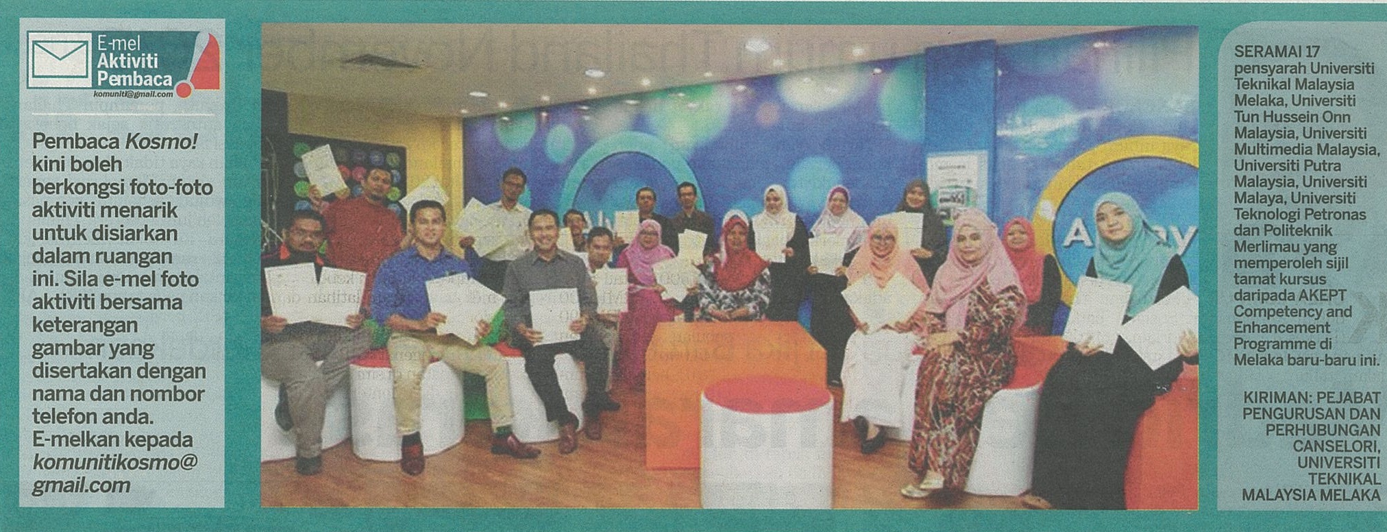 Seramai 17 pensyarah UTeM, UTHM,UPM,UM,UTP, Politeknik Merlimau yang memperoleh sijil tamat kursus daripada AKEPT Competency and Enhancement Programme di Melaka bru-baru ini