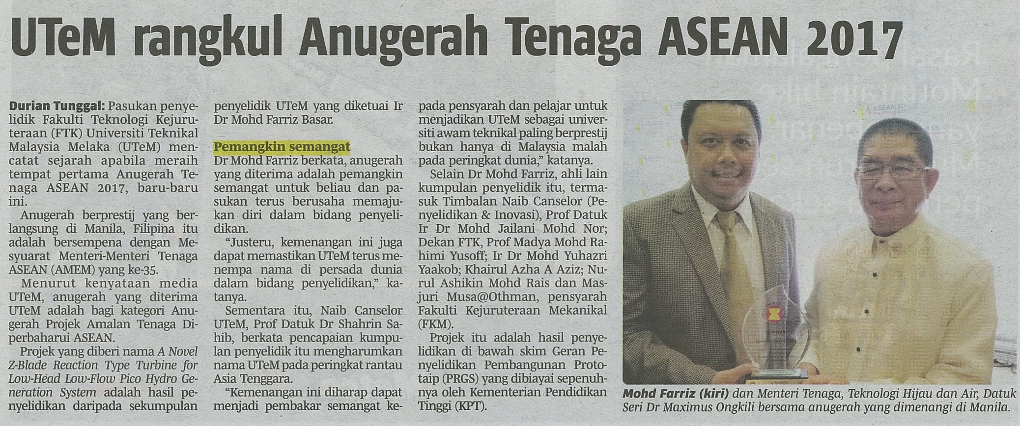 UTeM rangkul Anugerah Tenaga ASEAN 2017