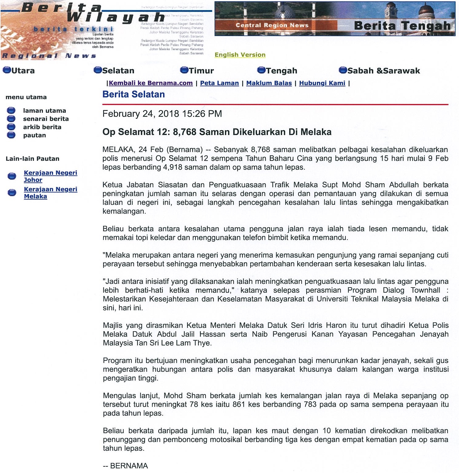 Op Selamat 12 : 8768 saman dikeluarkan di Melaka
