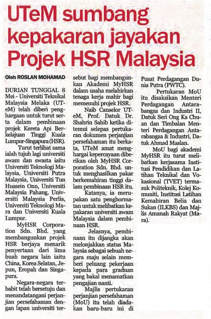 UTeM sumbang kepakaran jayakan Projek HSR Malaysia