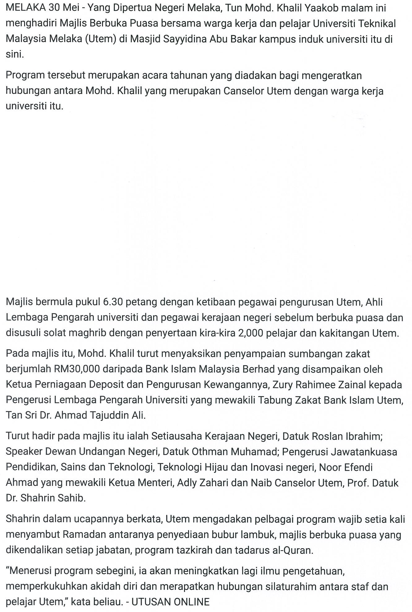 Tun Mohd Khalil berbuka bersama warga UTeM