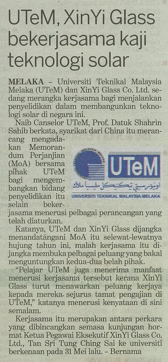 UTeM, XinYi Glass bekerjasama kaji teknologi solar