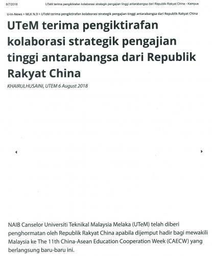 UTeM terima pengiktirafan klaborasi strategik pengajian tinggi antarabangsa dari Republik Rakyat China