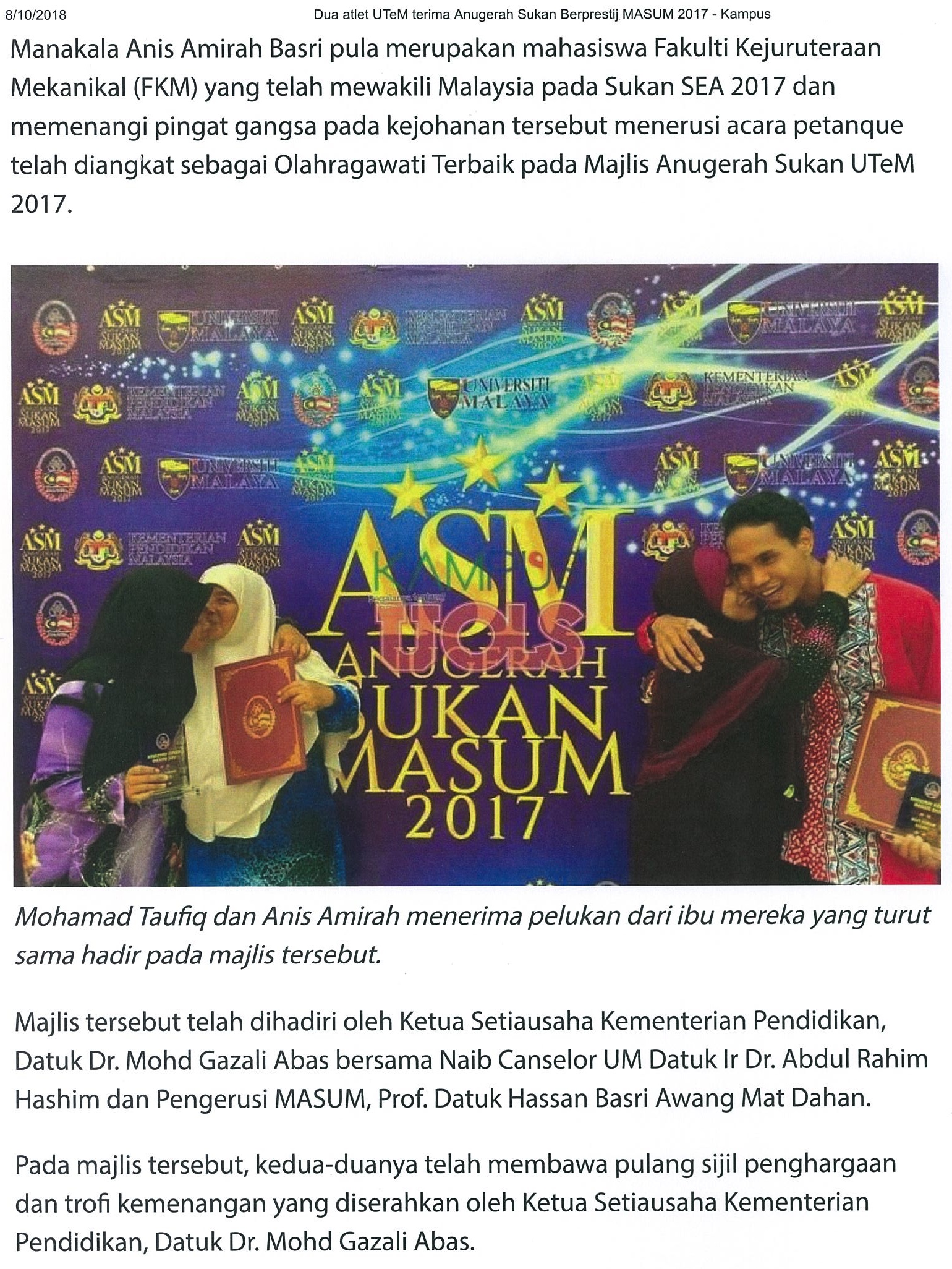 Dua atlet UTeM terima Anugerah Sukan Berprestij MASUM 2017
