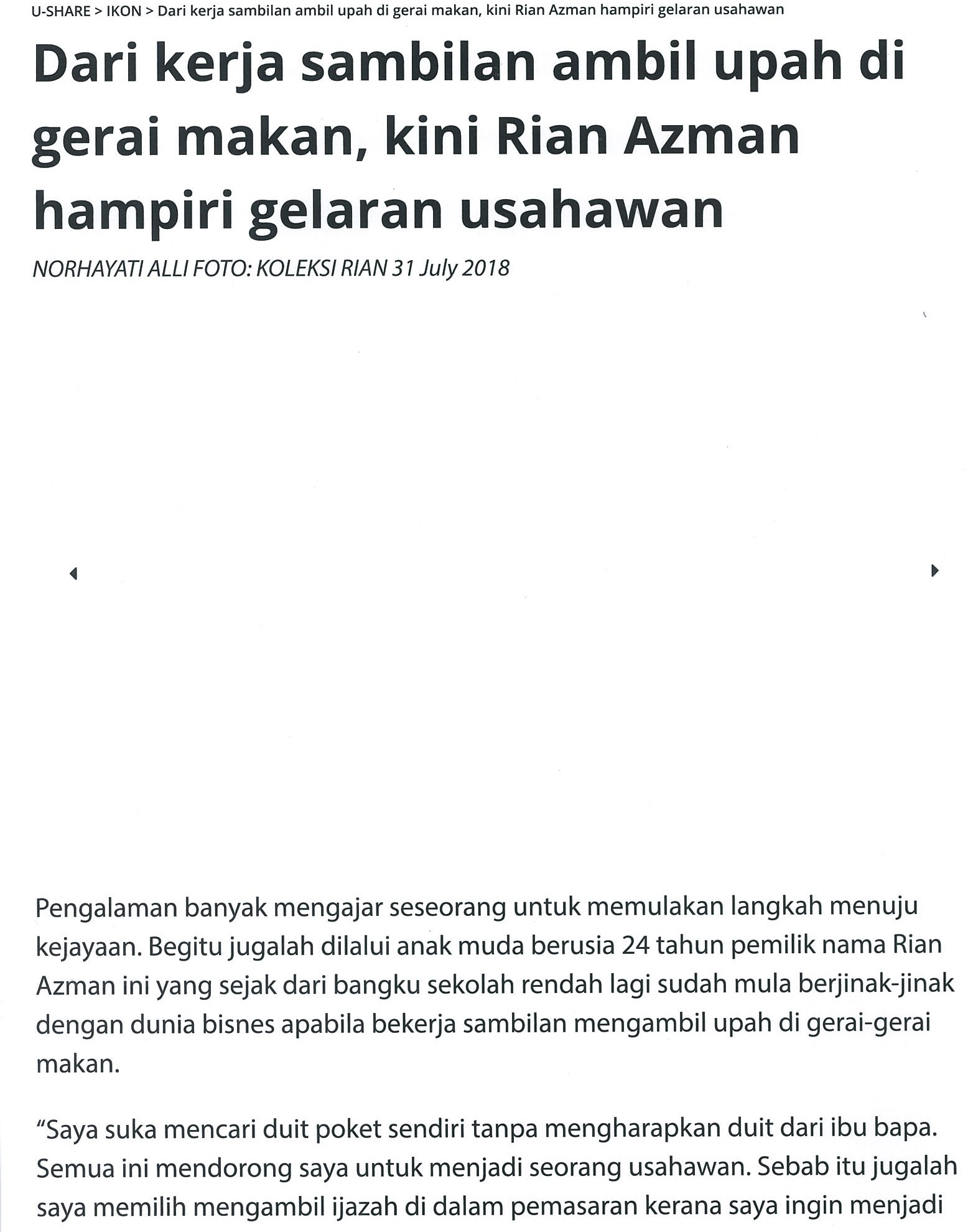 Dari kerja sambilan ambil upah di gerai makan, kini Rian Azman hampiri gelaran usahawan